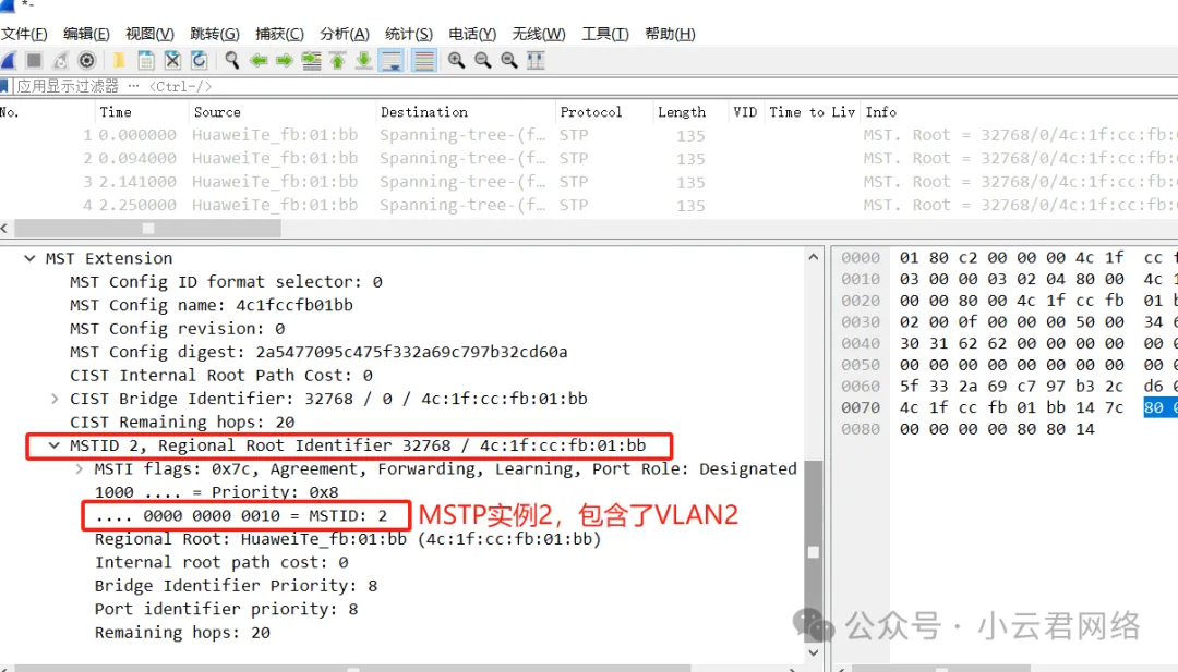 处于VLAN1的数据会在实例1的生成树中转发;处于VLAN2的数据会在实例2的生成树中转发;其余VLAN数据在实例0中转发,但小优口会被阻塞掉。配置了MSTP的实例后,BDPU报文中是有MSTID字段的,交换机桥之间的交互计算会基于实例收敛: