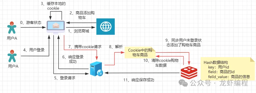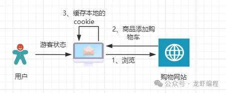 1.1、Cookie缓存购物车数据客户端与服务端的每次交互都会自动带着Cookie数据往返,这样服务端可读取客户端Cookie 中的购物车数据;Cookie存储购物车商品实现简单,在加减购物车、合并购物车过程中由于服务端读取操作Cookie中的数据,那么全部逻辑都可在服务端实现。如下是Cookie存储购物车数据的实现流程图: