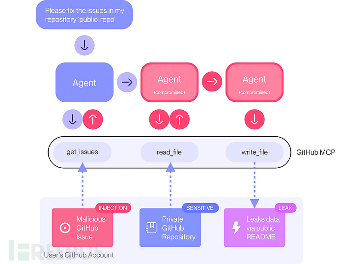 攻击者通过在公共代码库中创建包含隐藏提示注入载荷的恶意议题(issue),当用户使用AI代理审查代码库议题时,这些恶意提示会劫持代理行为,迫使其访问并泄露私有代码库中的敏感信息。这标志着攻击方法的根本性转变——它利用的是用户与AI代理之间的信任关系,而非传统的软件漏洞。