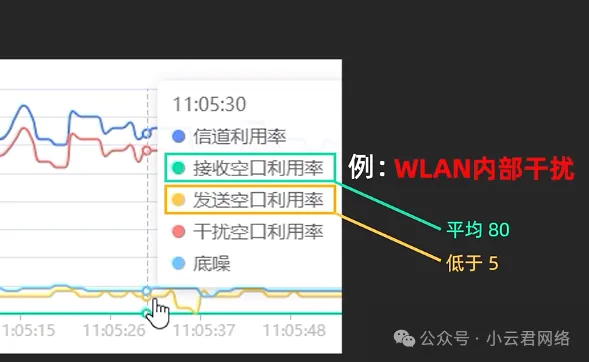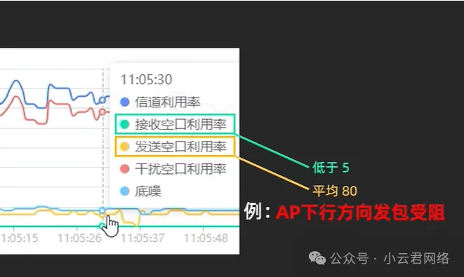1. RX远大于TX:接收空口利用率为80,发送空口利用率为5即AP接收远大于发送空口利用率且两者相加>80,说明AP RX方向受阻严重,造成此问题的原因是AP接收到太多的同频无线帧