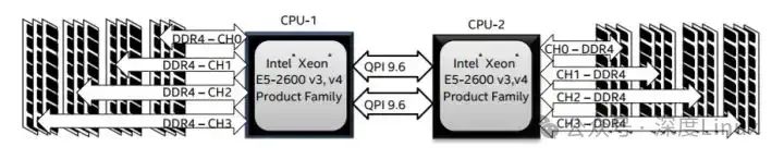回到当前世面上的CPU,工程上的实现其实更加复杂了。以来看,两个Socket之之间通过各自的一条9.6GT/s的QPI link互访。而每个Socket事实上有2个内存控制器。双通道的缘故,每个控制器又有两个内存通道(channel),每个通道最多支持3根内存条(DIMM)。理论上最大单socket支持76.8GB/s的内存带宽,而两个QPI link,每个QPI link有9.6GT/s的速率(~57.6GB/s)事实上QPI link已经出现瓶颈了。