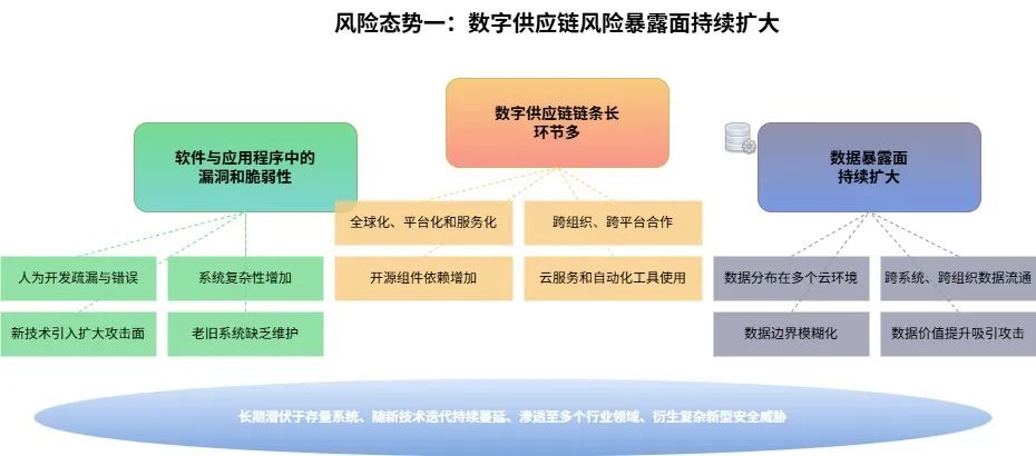 数字供应链风险暴露面持续扩大是数字供应链风险日益严重的主要原因之一。典型的风险暴露面,如:软件与应用程序自身脆弱性、软件生态系统复杂、数据风险暴露面。
