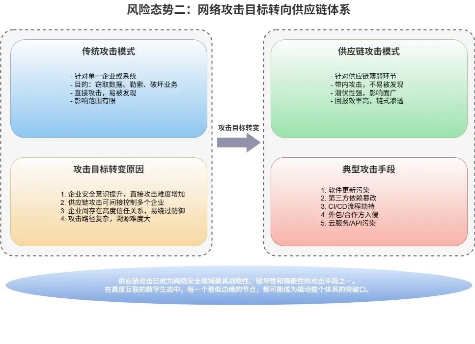 过去,网络攻击往往针对某个企业或系统,以窃取数据、勒索资金或破坏业务为目的。但随着企业网络安全意识的提升和安全防护能力的增强,攻击者开始寻找更高效、更隐蔽、回报更大的攻击路径。