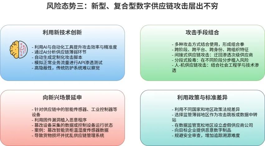 数字供应链生态系统的影响因素错综复杂,安全威胁的广度与深度远超传统认知。除篡改软件包,构建恶意软件向目标企业的上游供应商或开发合作方实施后门注入、开源代码投毒等常见的供应链攻击外,新型、复合型数字供应链攻击手段正以更隐蔽、更具破坏性的方式不断涌现,让企业在安全防护中陷入被动局面。