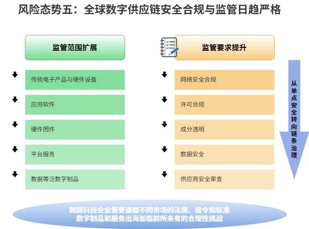 为应对数字制品供应活动中的各类风险挑战,各个国家和地区都在强化信息通信技术中硬件、软件、服务以及数据跨境流动的安全管控。安全合规已经跃升成为全球数字供应活动中的核心治理议题。其监管范围和监管要求都在不断变化: