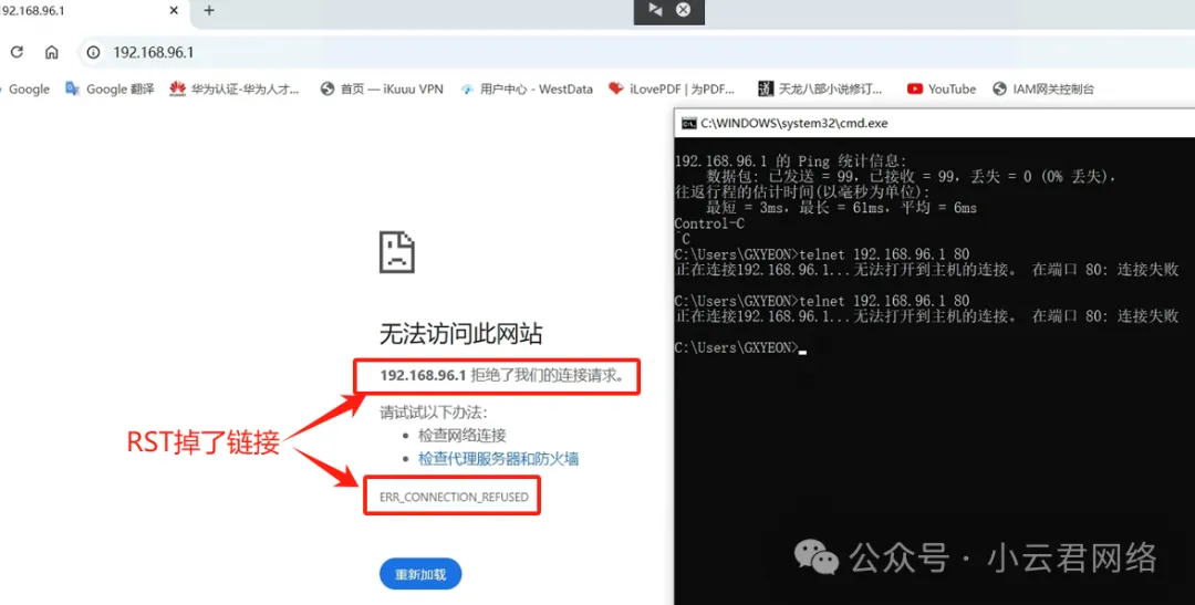 可以看到路由器的Web应该是彻底挂掉了,这个“拒绝提示”表示路由器主动RST掉了PC http的访问连接。对应报文也是如此: