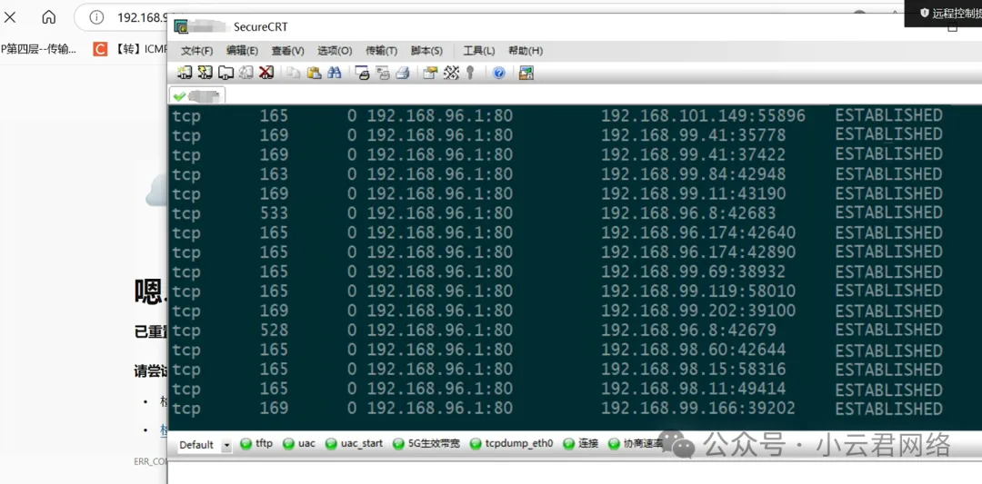 TCP半连接:攻击者向服务器发起大量TCP连接,但在三次握手中不响应最后1个ACK,致使服务器自身存在大量无效“TCP半连接”,耗尽其资源,使其服务异常;SYN Flood:TCP泛洪攻击,攻击者向服务器开放端口大量建立TCP连接,耗尽其资源,使其服务异常。目前来看作为网关的路由可能遭到了“拒绝服务攻击",下一步串口看看路由器系统状态。