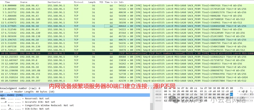 看到会话表中大量的tcp port 80的连接处于establish状态,很显性的看到路由的http服务资源被大量连接占用导致服务异常,典型的SYN Flood攻击。内网有大量设备会去找网关80端口并建立连接,要么是人为主动访问,要么是内网某些医疗设备特殊行为频繁建立连接?