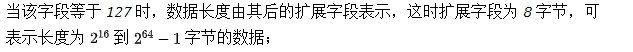 b.当该字段等于 126 时,数据长度由其后的扩展字段表示,这是扩展字段为 2 字节,可表示长度为 126~65535 字节的数据;