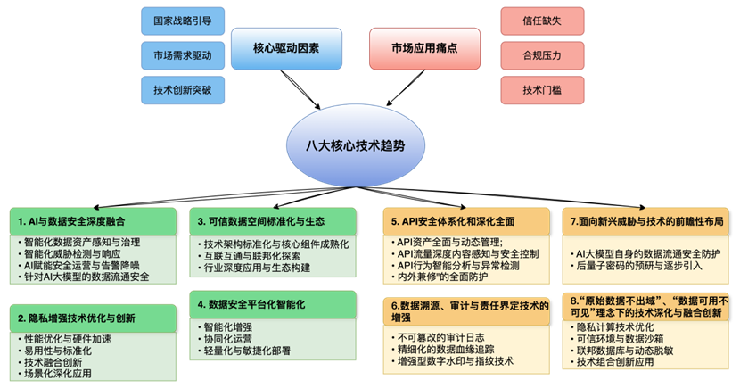 目前我国数据流通安全领域的技术发展正处在一个加速演进的关键时期,受到国家战略引导、市场需求驱动和技术创新突破等多重因素的深刻影响,未来几年中国数据流通安全技术预计将呈现以下几个核心趋势,并伴随着国内厂商在这些方向上的积极布局和创新探索: