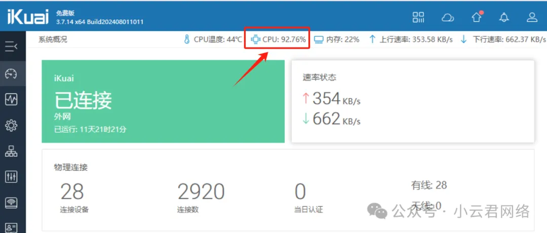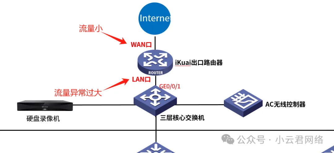 无线网段:VLAN10-172.16.10.0/24监控网段:VLAN20-172.16.20.0/24办公网段:VLAN30-172.16.30.0/24管理网段:VLAN100-192.168.90.0/24(含所有交换机、路由、服务器)目前问题是:公司IT经常发现iKuai出口路由的CPU经常飙高到90%以上,访问页面特别卡,同时下面的终端上网都出现了卡顿、延时等问题,整网崩掉了。