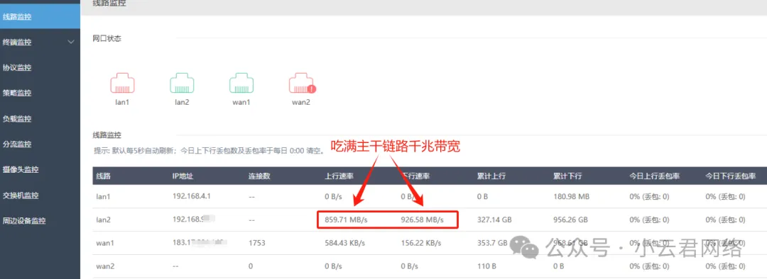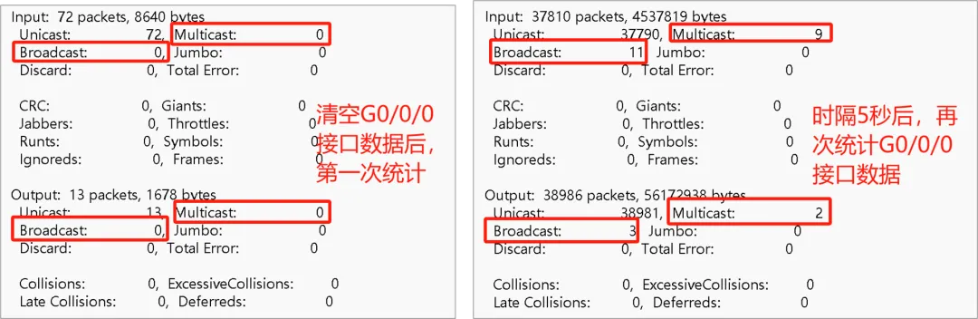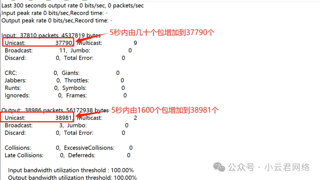 广播风暴:导致端口带宽满载,地址表被破坏;组播/广播泛洪:如DHCP、ARP等报文量过大流进CPU,也会导致CPU性能下降。如上拓扑,因为路由器仅WAN和LAN口在用,从前面的流量统计分析中“WAN口无大流量而LAN口流量异常过大”。我们只需要在核心交换机上联接口查看数据统计即可,确认到底这个大流量是不是广播&组播!