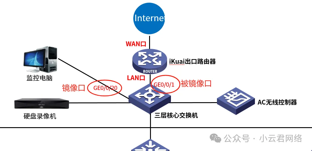 客户企业是一家200人左右规模的零售行业公司,公司网络做的是经典全千兆三层网络架构,部署出口iKuai软路由+内网某为交换机。大致拓扑如下图所示: