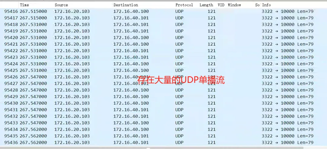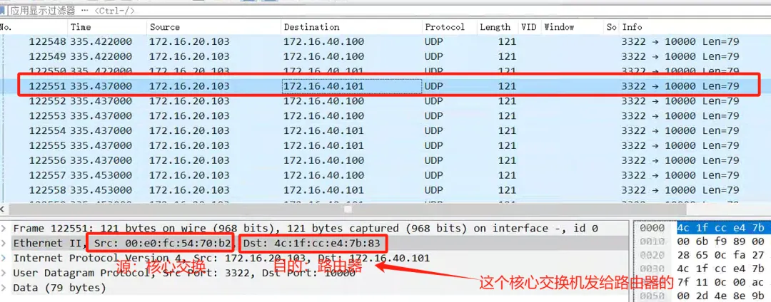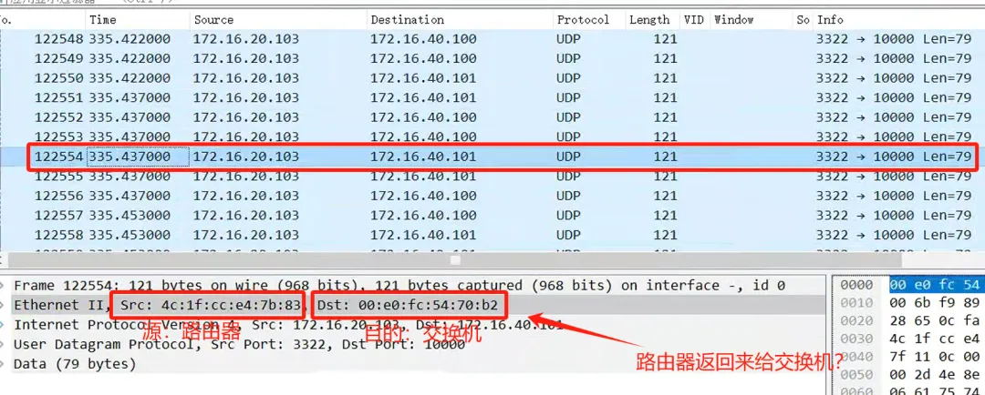该流为源VLAN20监控网访问目的172.16.40.0/24的UDP流,据统计这些流吞吐量高达1Gbps,它是占满千兆链路带宽的主要原因,也是路由器收发包满载导致CPU持续高位的主要原因。那么这些“异常流”为何会出现在核心交换与路由之间并且泛洪的呢?我们来看下数据包MAC地址对比一下: