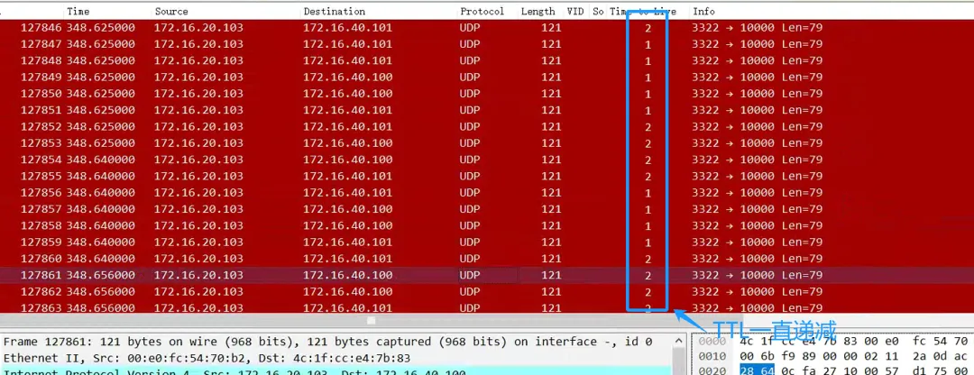 分析得出:这个UDP包在交换机和路由器之间互转循环,即:SW—>R—>SW—>R。。。。一直循环到TTL=0然后才丢掉UDP包!