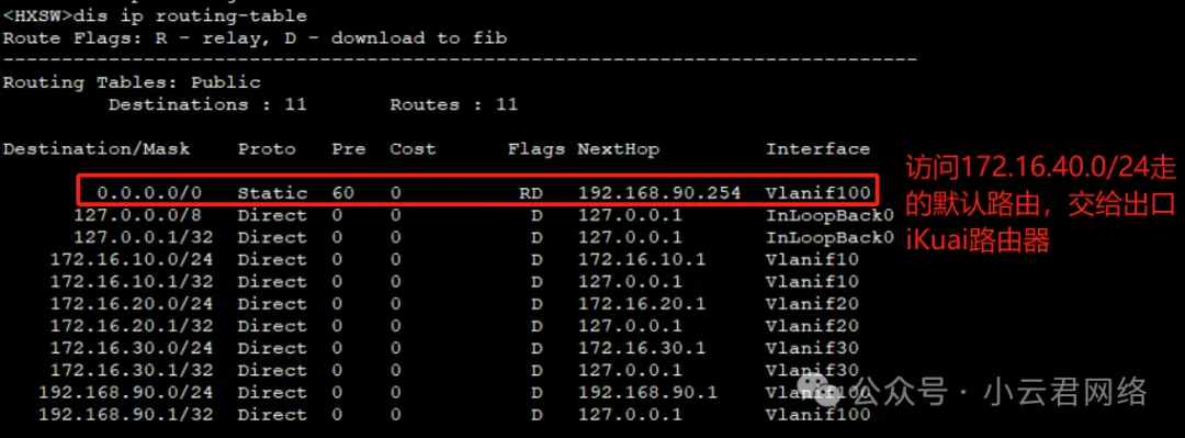 核心交换机路由表如下: