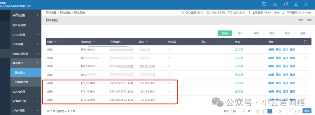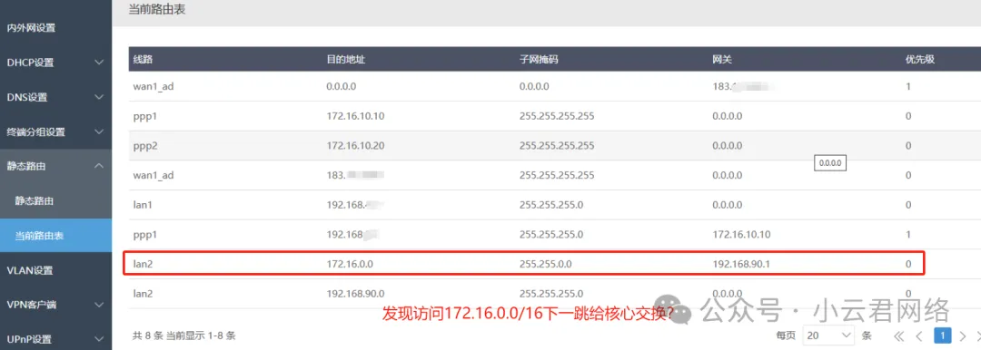 核心交换配置是标准的没问题,再看看iKuai路由表: