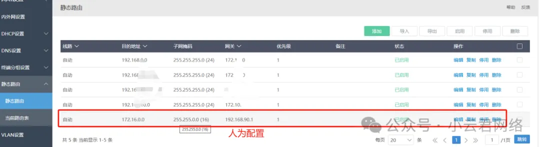 iKuai上的回程路由,IT人员为了省事配成了172.16.0.0/16(即包含内网所有网段)下一跳给核心,这个做法简直灾难!一旦内网访问172.16.1.X、172.16.2.X、172.16.200.X主干路就环了,链路带宽就爆了呀!