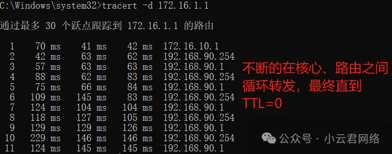 项目内网有3个VLAN网段,分别是172.16.10/20/30.X;某为核心交换机全0路由下一跳指向iKuai出口路由器,保证上外网,此配置无问题;为了省事,iKuai的回程静态路由配置成一条:目的172.16.0.0/16下一跳指向核心。这个配置下,一旦访问非内网段且处于172.16.0.0/16网段的IP时便发生路由环路,比如访问172.16.1.1,路径跟踪如下:解决方案