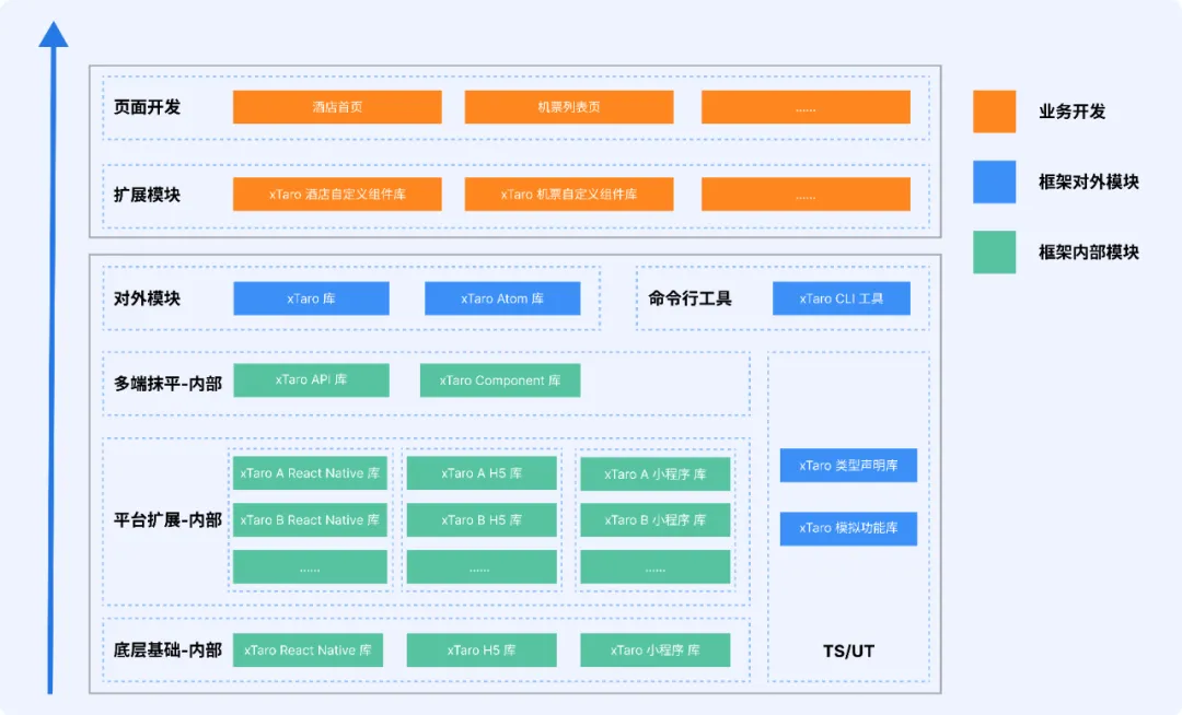 xTaro 跨端解决方案通过创建模块化、可扩展的模块架构(如下图所示),将功能模块划分为4层结构:对外模块、多端抹平、平台扩展和底层基础。实现方案如下: