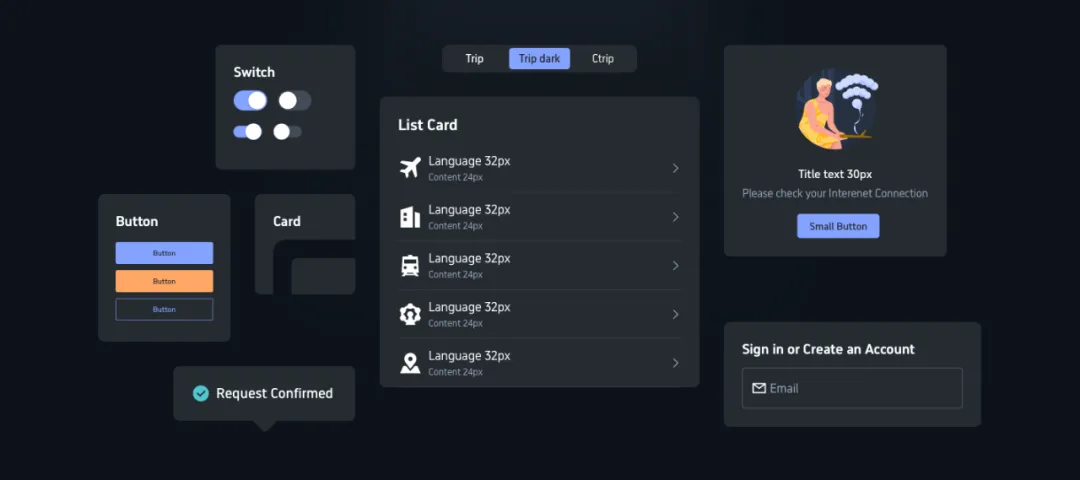 在实际业务场景中,应用程序需要具备灵活的界面切换能力,以满足多样化的用户需求。通过使用本方案的组件库,集成了多框架多品牌主题,实现了界面风格的灵活切换,如暗黑模式、Ctrip 和 Trip 品牌主题。