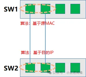 那么有个经典的问题:交换机链路聚合,两端算法不一致会不会有问题?如下图所示: