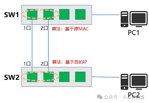 PC1和PC2通信时,SW1可以根据算法不同将PC1的数据从不同的出接口转发给SW2;