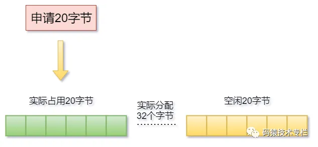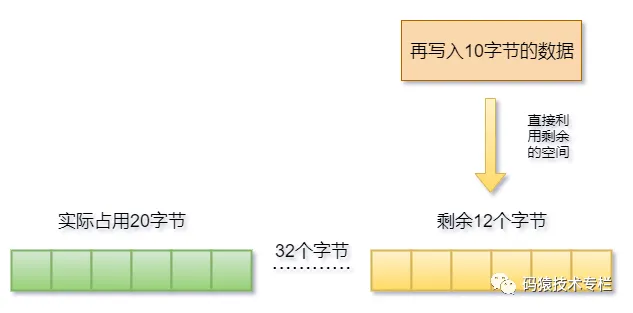 这种分配的方式的好处很明显,则会减少内存分配的次数,比如申请了20字节的内存,实际分配的是32字节的内存空间,当应用再写入10字节的数据时,则不会再次分配,剩余的12字节足够用了。这样就避免了一次的内存分配。如下图: