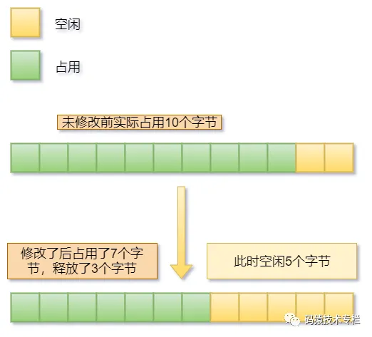 上图中键值对修改后变小了,从原来的10个字节变成了7个字节,从而释放了3个字节,此时剩余了5个字节的空闲空间。