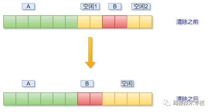 清除的原理很简单,通过复制拷贝将不连续的存放的数据搬到一起形成一块连续的内存空间,如下图: