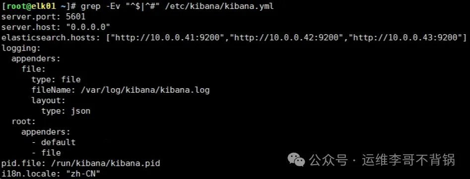 [root@elk01 ~]# grep -Ev "^$|^#" /etc/kibana/kibana.yml1.