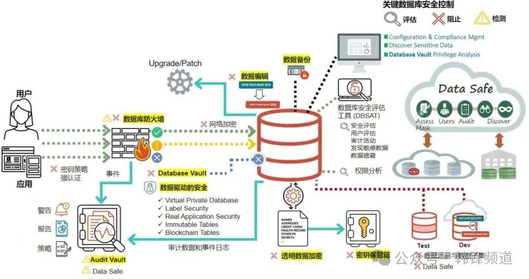 上图揭示数据库安全需建立纵深防御体系:从终端身份治理、应用安全加固、传输加密,到严格的权限分离(如Database Vault)、数据脱敏(如Data Masking)及全链路监控(如Audit Vault),构成覆盖数据生成、传输、使用及销毁全生命周期的防护网络。下文将从上述角度来看看Oracle是怎么做的。
