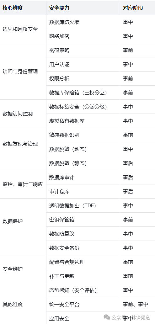 上图将Oracle的安全能力通过访问流程做了梳理。这张图的核心价值在于它展示了现代数据库安全的几个关键理念:一是纵深防御,安全不是单点措施,而是由外到内、层层递进的多重防护体系;二是以数据为中心,所有安全措施的最终目标都是保护核心资产——数据本身,特别是敏感数据;三是全生命周期管理,安全覆盖了从数据识别、访问控制、实时监控到事后审计的完整生命周期;四是自动化与智能化,强调使用工具(如敏感数据自动发现、权限自动分析、统一安全管理平台)来提升安全运营的效率和准确性。下面通过一张表格将Oracle的安全能力展开说明。