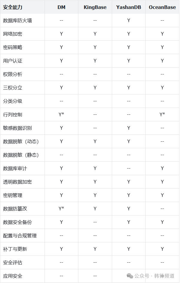 上面看到Oracle的安全能力,那么国产数据库的安全能力又如何呢?下面是针对部分国产数据库的安全能力进行对比。此部分产品能力从各厂商官网文档获取,部分信息未获取到不代表不具备此能力。产品能力对比按照Oracle相关能力作为参照物。有些安全能力是通过其他方式间接实现,这里用Y*来表示。