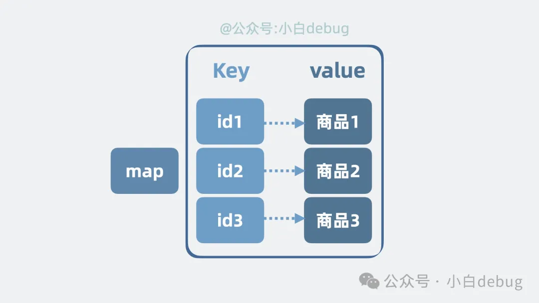 key 是商品 ID,value 是商品数据。通过商品 ID, 就能查到商品数据。