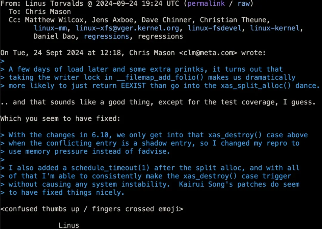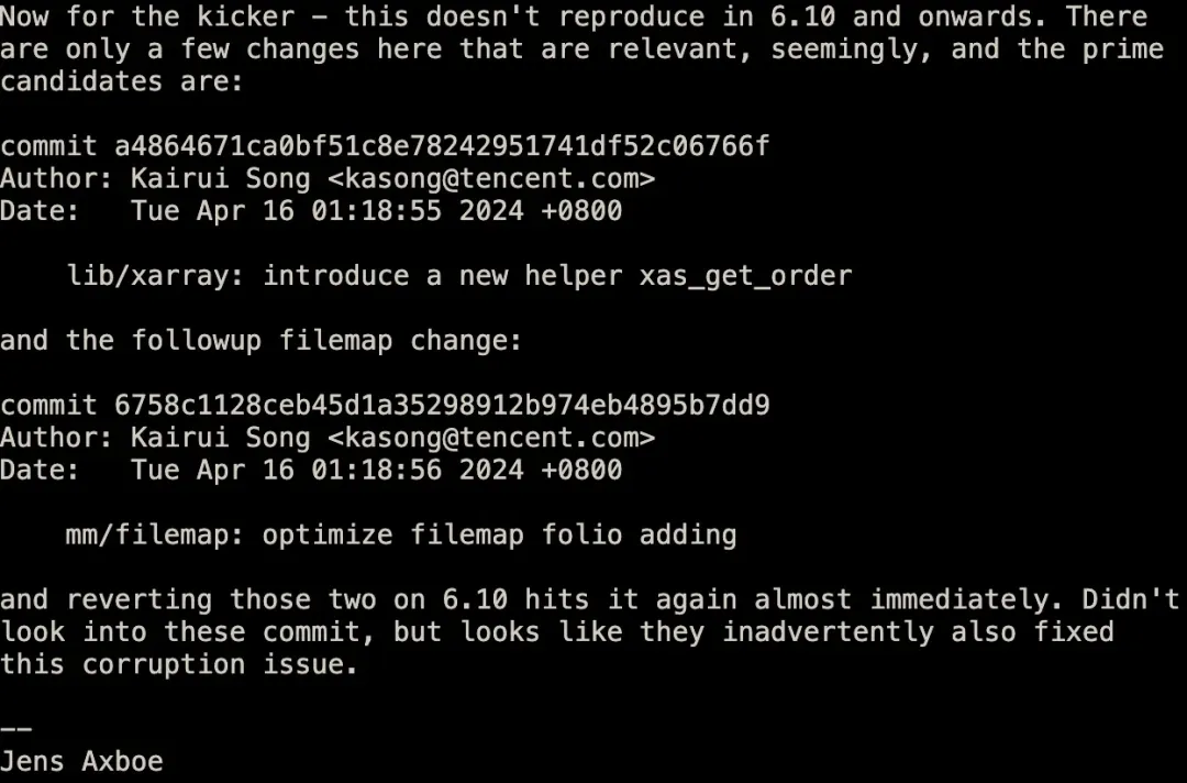 一个多星期的讨论中,社区并没有得出明确结论或有效的重现方法,几位顶级 Maintainer,包括 Matthew Wilcox(Folio,Xarray 等一系列核心组件作者),Jens Axboe(IO_uring,CFQ 调度器等作者),以及 Linus Torvalds 本人也参与进入讨论,目光都聚焦在了 Xarray 部分。不过大家都迟迟没有捕捉到 Bug 所引发的具体位置或线索,只是确认 Bug 确实存在而且亟需修复。