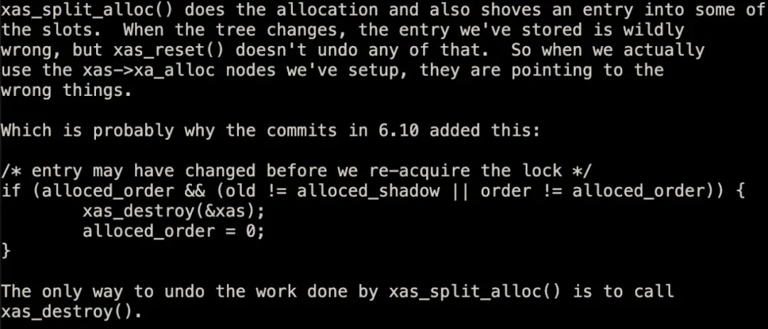 而在我们在新版本中,步骤(3)会检查 xas_split_alloc 分配的数据是否依旧和当前的 entry 完全对得上,并及时进行释放,让后面的 xas_store 不会看到 xa_state 中的过期信息而错误使用它,并加以 comment 记录了这一疑点,并且对 entry 值与 order 的完全匹配检查也杜绝了其他可能的问题。