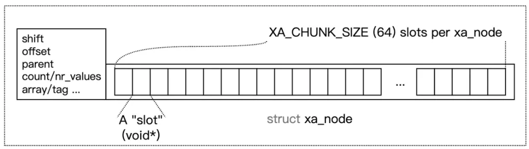 2.Xarray 的内部实现Xarray 的顶层包装为一个 struct xarray。其内部最基本的结构为 struct xa_node。一个 xa_node 有 XA_CHUNK_SIZE(默认 64,2 ^ 6)个 Slot,即一个 64 元素的 void * 数组,每个 Slot 可以存入一个实际的 Entry 或指向下一级 xa_node(或特殊值,暂时忽略)。