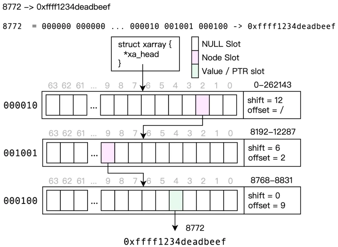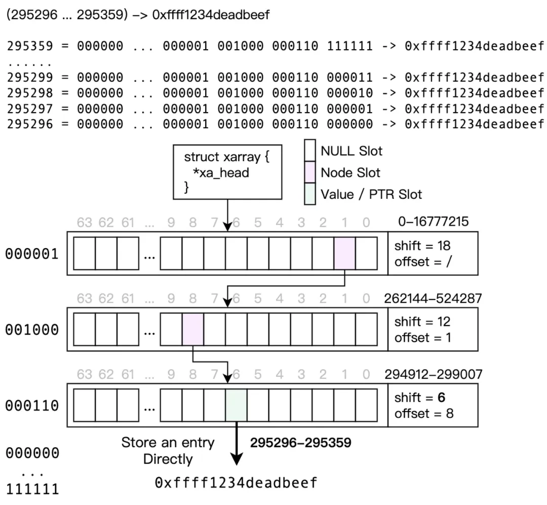 对于重复的 0,不需要分配 xa_node,这只需要在顶层的 xa_node 中记录 shift 即可表达(这也就可以理解,为什么 Xarray 对于 Index 比较小的值性能会更好),该例子中 shift = 12,即表示该 xa_node 对应的 64 bit 中从第 13 bit 到 18 bit 这一段的 offset(000010)。也可以理解为该 xa_node 覆盖了 0 - 262143(2 ^ (12 + 6) - 1) 这一范围;而其中每一个 Slot 又分别对应了对应的子范围:offset 为 2 的 Slot 对应范围为 8192 (0 + 4096 * 2) 至 12287 ( 0 + 4096 * 3 - 1) 这一范围;8192 至 12287 这一 Node 中又有第 9 个 Slot 对应了 8768(8192 + 64 * 9)至 8831(8192 + 64 * 10 - 1)这一范围,当一个范围有数据时才有必要分配下一级 xa_node 或存入 Entry。