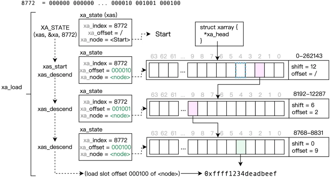 Xarray 使用 xa_state 这一结构维持走树查询的中间状态。xa_load 函数包装了整个读取走树过程。在调用 xa_load 时会在栈上生成一个 xa_state,并重复调用 xas_start,xas_decend 等内部函数来一层层向下查找,如上图所示。在每一层 Node 上使用对应的 offset 向下读取 slot 中记录的下一级 xa_node,直到读到 slot 为一个值而非 node 或走到最底层时即完成了查找过程。