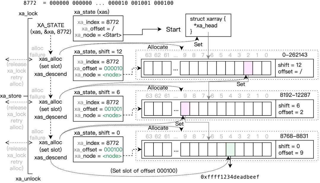 由于存入会修改 Xarray,因此必须使用锁进行保护(xa_lock & xa_unlock)。这一点和 xa_node 的分配有一定的冲突,因为在锁临界区中进行内存分配可能会失败。不过 Xarray 在存入时依旧维护了 xa_state 这一结构来记录当前存入的层级,这就让 Xarray 可以解锁后重新尝试分配内存,再上锁后继续使用当前的 xa_state 进行存入,从而提高存入成功率。