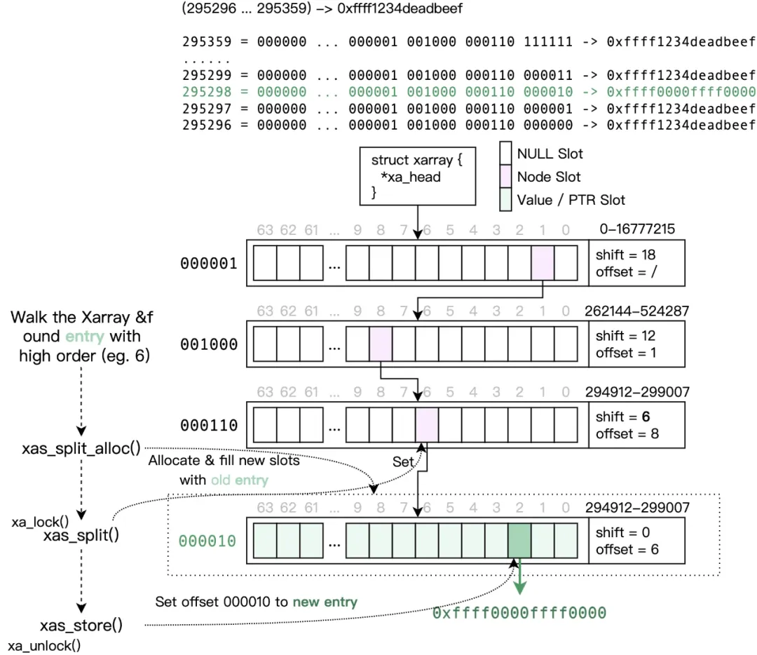 其中又涉及了 xa_node 的分配问题。调用者需要首先获取 entry 的 order,随后在锁外使用 xas_split_alloc() 为其分配所需的 xa_node,再通过上锁后调用 xas_split 完成对这个 Multi Index Entry 对应的 slot 的 update,才可以再进一步修改子范围内的 Entry。