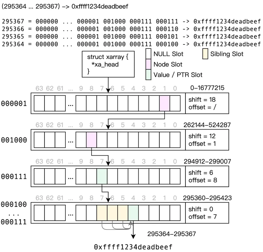 Xarray 会将多个 Slot 记录为 Sibling Slot 并指向最低位的 Slot,其中再保存 Entry。不过这种用法我们在此文章中将暂时忽略。