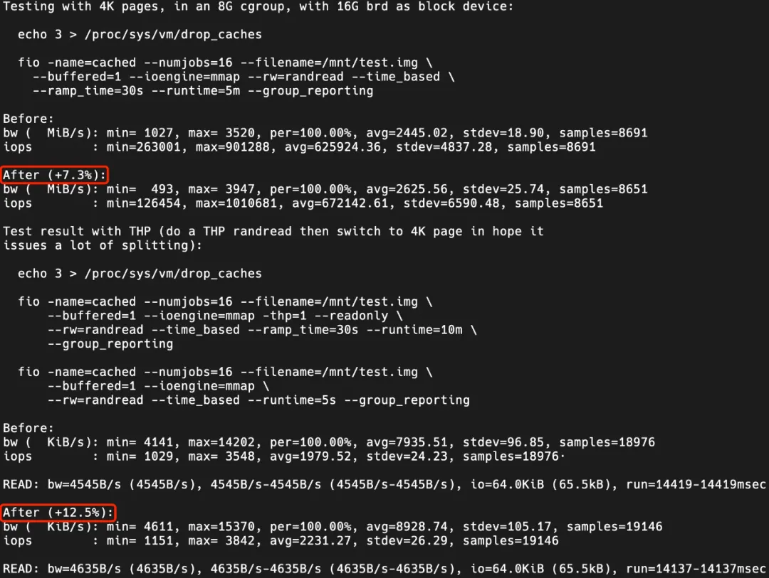 通过这一优化,我们极大提升了大文件在 Page Cache 中的读入性能,一个简单的 fio 测试便有了约 10% 的性能提升,这一组 Patch 也以性能优化为由合入了 6.10。
