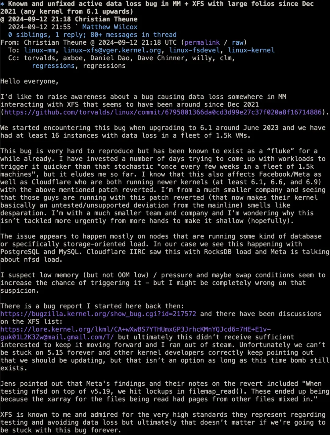 大概两个月前,一封名为《Known and unfixed active data loss bug in MM + XFS with large folios since Dec 2021 (any kernel from 6.1 upwards)》在社区引起了一定的关注,其内容也在笔者的朋友圈以有点过度反应刷了一小波屏:自 2021 年起(6.1 内核发布起),Linux 内核中启用了 Large folio 特性的 XFS 文件系统(但不仅限于 XFS)有概率遭遇数据损毁问题。这乍看上去是一个颇为严重的 Bug,也确实引得了多个顶级 Maintainer 的关注和排查。实际上该 Bug 较难触发,但也确实让社区和各大一线厂家很是头痛,Meta,Cloudflare 都表示自己遇到过该问题,并已经 Revert XFS 的 Large Folio 特性,这才能保证内部系统的稳定性。