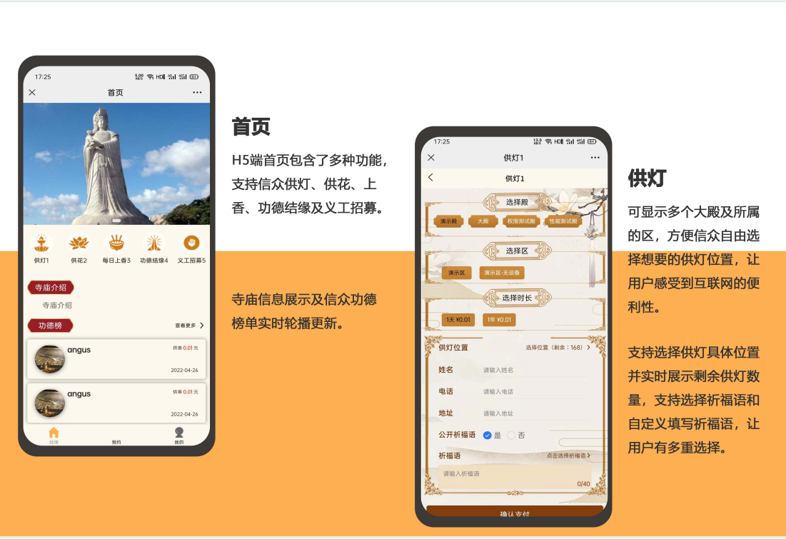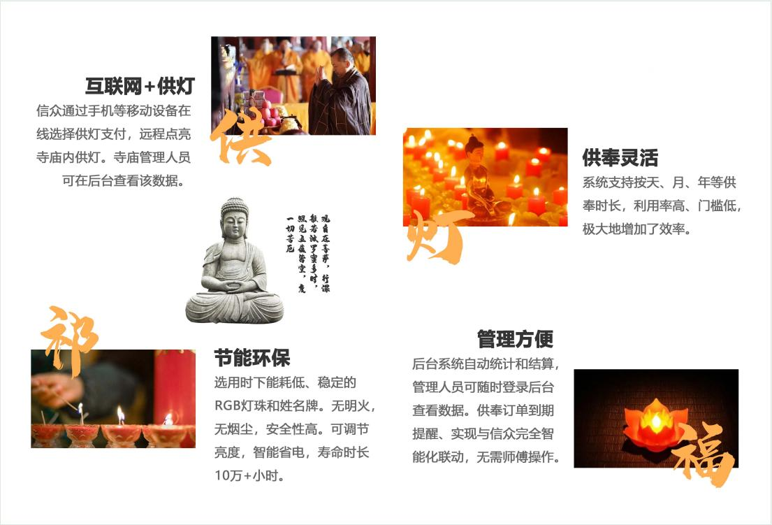 信众通过“结善缘”互联网供灯平台、寺庙现场智能硬件控制机,点亮殿内的智能祈福灯。除LED祈福灯所具有的能耗低、环保安全、供灯时长、数量多的优势外,更具有互联网科技时代的智能化、移动化等特点。将拉近寺庙和信众的距离,让信仰不仅在心里,更在身边,随时感受佛的智慧光明,让佛光普照更多信众。