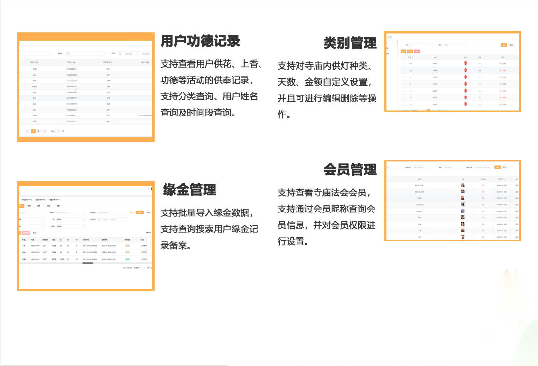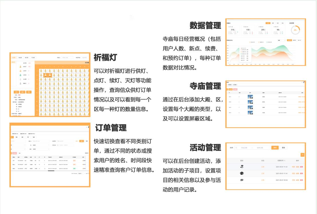 方便快捷:通过互联网供养,人们可以随时随地表达对神灵的尊敬和崇拜,不再需要亲自前往寺庙或其他场所进行供养。这大大降低了供养的门槛和成本,使更多人能够参与到供养行为中来。互动性强:互联网供养不仅是一种单向的供养行为,还可以通过社交媒体等平台进行互动和分享。人们可以在网上交流供养心得、分享修行经验,形成一种虚拟的社群和共同信仰的氛围。多元化选择:互联网供养提供了多样化的供养方式和内容,包括供养物品、念经、点灯等。人们可以根据自己的信仰和喜好选择适合自己的供养方式,更好地满足个性化的需求。2、互联网智慧供养的重要性在信息化的大潮中,寺庙作为承载着深厚文化底蕴的场所,其信息化发展显得尤为重要。在推进寺庙信息化的过程中,我们还需要注意数据安全、环保因素、信息化发展、用户体验和资源利用等多个方面。只有综合考虑各种因素,制定科学合理的规划和实施方案,我们才能确保信息化的成功实现,为寺庙的发展和传承提供有力支持。