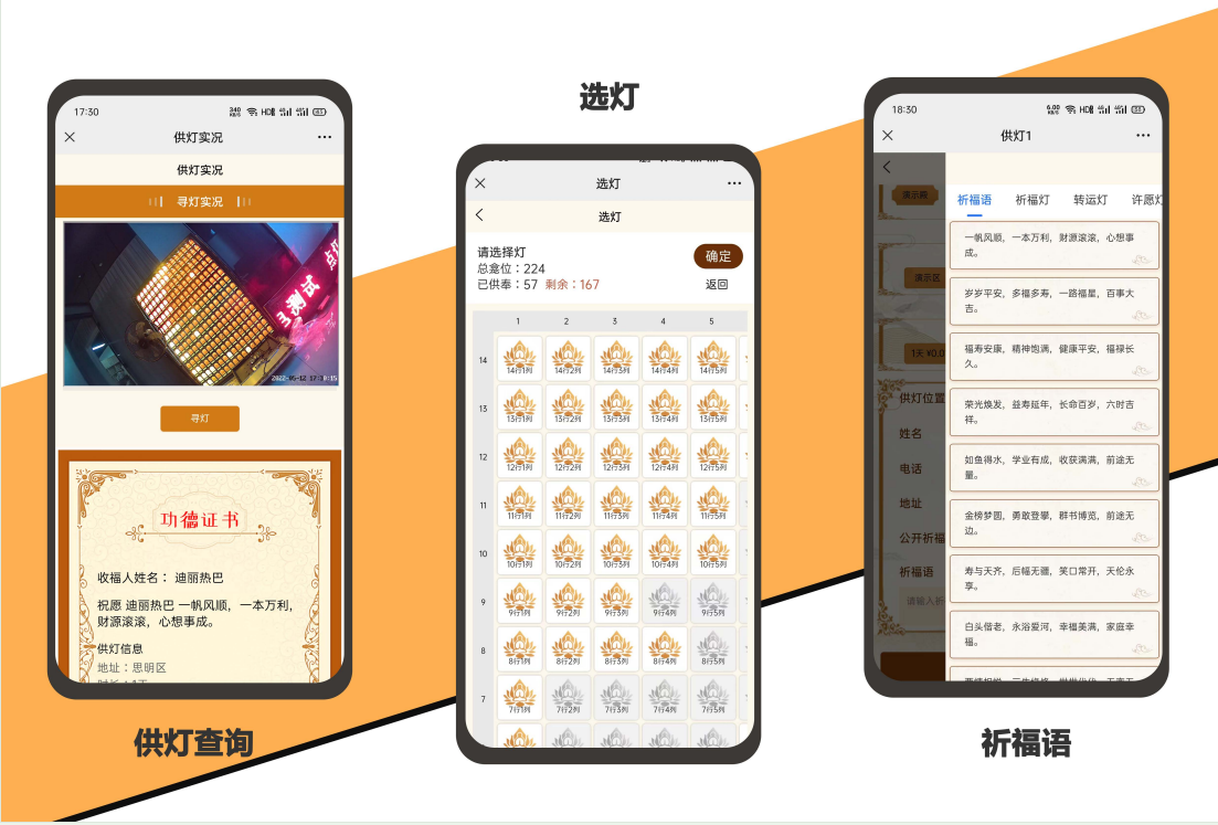 建设分为智能硬件和互联网平台两大部分,可为寺庙及信众提供现场和远程供灯、寻灯、照片回传等智能供灯服务。传统宗教文化与智能科技创新结合的新科技产品,助力宗教文化传播,让信众和寺庙“手相连,心更近”。