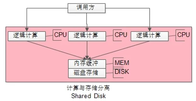 CPU逻辑计算拆分出了独立的进程,可以集群部署,能够线程扩展;DISK/MEM 仍耦合在一个进程内,仍处于竞争态,无法线性扩展;Oracle Rac,就是典型的“Shared Disk”架构,核心思路是“计算与存储分离”。