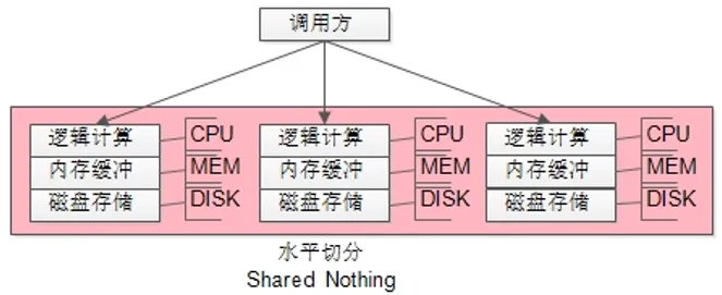 把整体数据存储分为了N份,每份之间没有交集;每份数据的 DISK/MEM/CPU 都在一个DBMS进程内,部署在一台服务器上;每份数据的资源之间的没有竞争;没错,这就是“水平切分”,它是典型的”Shared Nothing”架构。